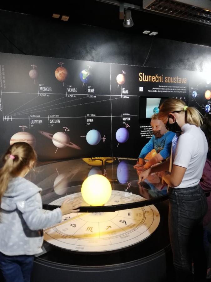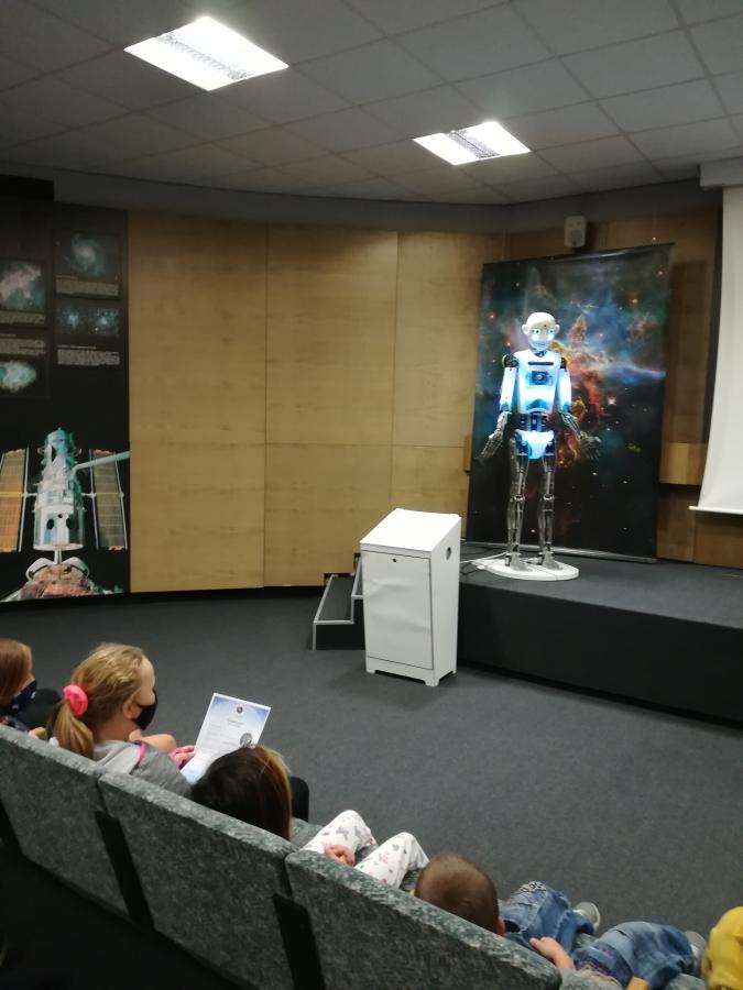 Po projekci si děti prošly celou expozici planetária, odpovídaly na otázky v pracovních listech, kde potom následovala aktivita s robotem Engiem. Robot Engie pomáhal s uváděním programu a odpovídal dětem na otázky z pracovních listů, které se týkaly expozic Planetária.